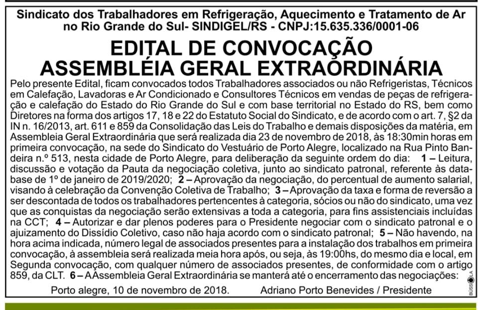 O Sindicato dos Trabalhadores em Refrigeração, Aquecimento e Tratamento do Ar no Rio Grande do Sul (SINDIGEL/RS) realiza Assembleia Geral Extraordinária no dia 23 de novembro, com a primeira convocação para às 18h30, no Sindicato do Vestuário, localizado na Rua Pinto Bandeira, 513.
